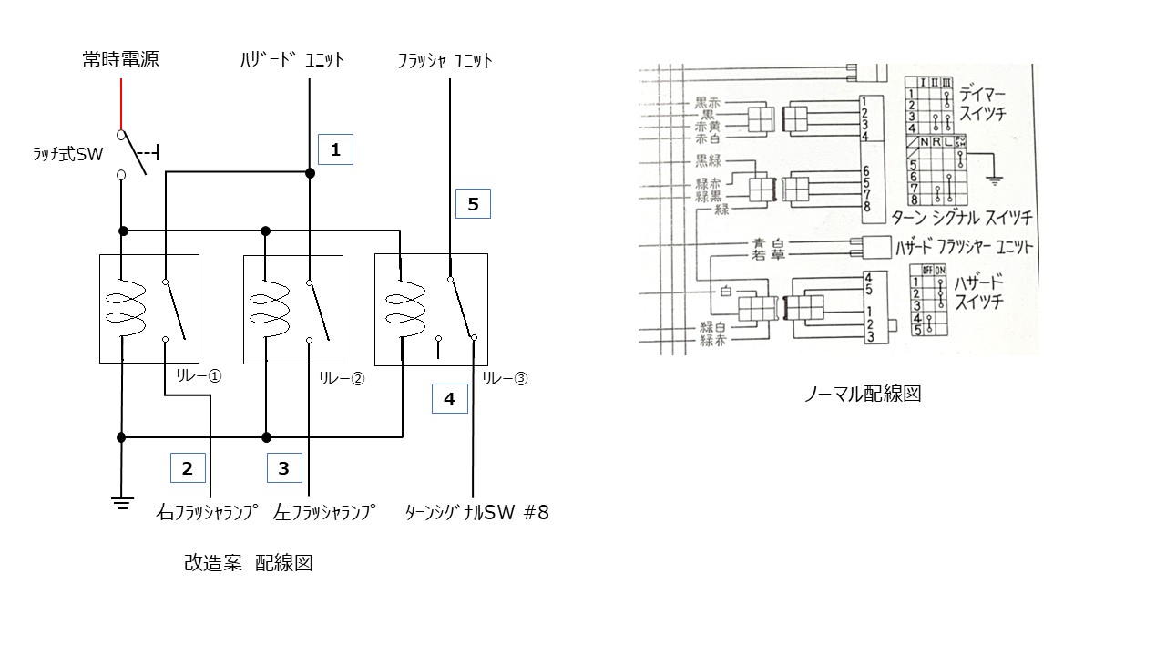 さてハザードの件は、スイッチ(以下SW)のケースビス穴かコラムカバー側の固定部分が折れてしまったのでしょうか。マークアップしていただいたSWは、マップランプのSWです。個人的には夜間結構使うのですが、使わないならハザードSWとして転用すると今の車風になりますね(笑) ハザードは確か1969〜70年頃に義務付けになったと記憶していますが、当時はサンキューハザードとか渋滞最後尾合図なんて風習は無かったので、本来の使用目的である非常停止表示しか使っていなかったハズですから、あんな引く<->押すのSWだったのだと思います。私は慣れましたが、ちょっと操作が面倒なので、マップランプ用のラッチ式SW(押すたびにON-OFFが切り替わるタイプのSW)を使うのは面白いと思いました。 という事で、マップランプSWをハザードSWとして使う時の回路案を画像で貼っておきます。ノーマル配線図の抜粋も併せて載せています。 ハザードSWというのは、単純な1回路のON-OFFではありません。というのは、ハザードONでウィンカーはキャンセルさせないとならないので、 ・SW:ONでウィンカー電源回路OFF ⇒ ハザードSW端子番号 #4、#5 ・SW:ONで左右各ウィンカー回路へハザードON ⇒ ハザードSW端子番号 #1、#2、#3 5端子が必要です。ワンテールになるとこれがもっと複雑になります。この回路にマップランプSWの様な1回路用の接点しか持っていないSWを入れる場合は、最低でもリレーを使う回路にしなければなりません。リレーは3つ。汎用リレーが使える様に1Mリレーを2個、1Tリレー(切り替えリレー)を1個を使う例を描きました。 ノーマルのハザードSW用6極コネクタを切り離して、下記回路に変更します。青い枠の番号は元のハザードSWの端子番号に相当します。 あとこの改造をした後は、マップランプSWボタン部のイラスト(逆さ日の出みたいな絵)は見えないようにして、ハザードSWのイラストシールを自作して貼り付ける必要があります。更に使わない元のハザードSWもイラスト表示部分は何か重ね粘りして「盲状態」にしてください。そうしないと車検に通らないかもしれません。 ![]() 1768399161.jpg/96KB |