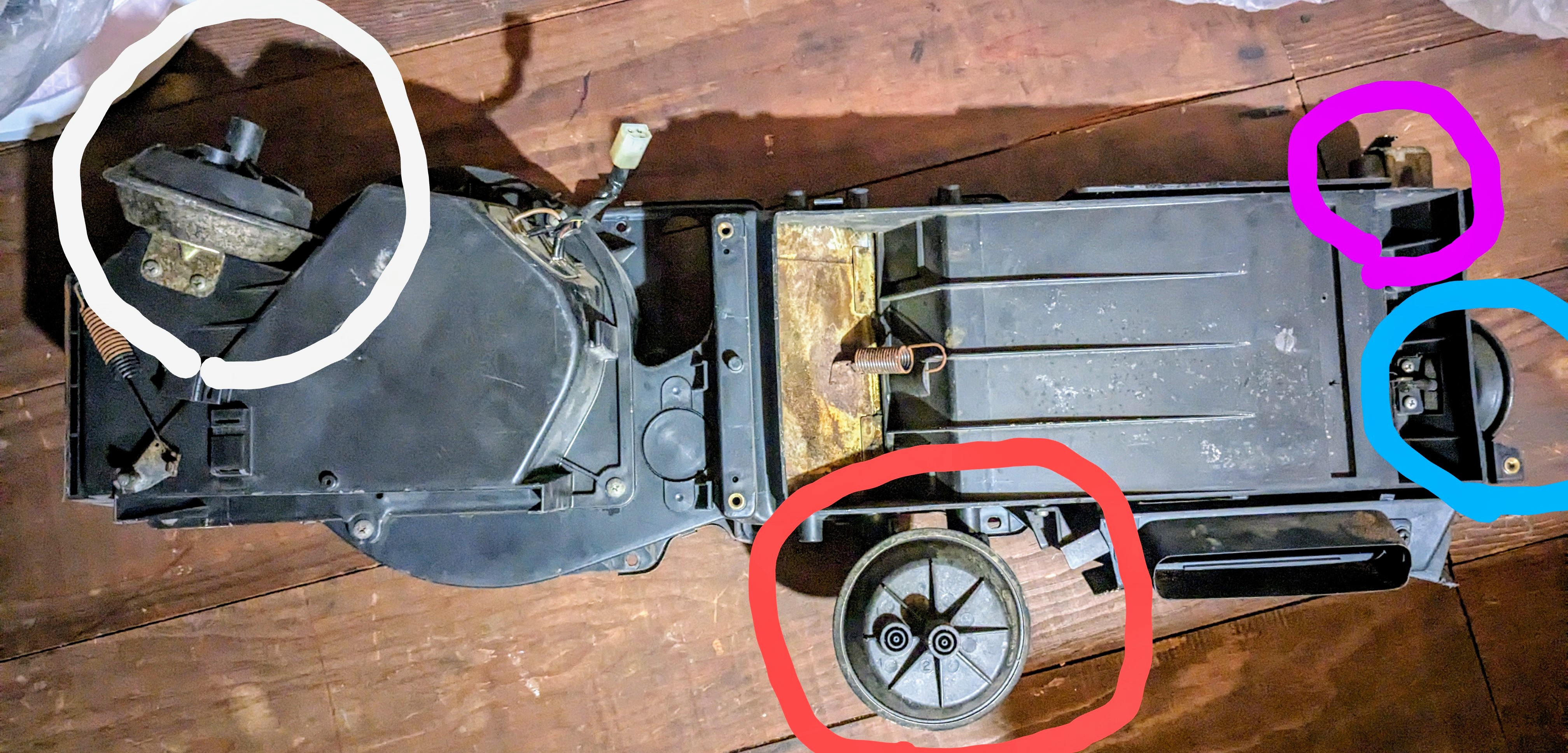MV@とAのホース及び電源を入れ替えてのチェックでは、吹き出し口切り替え→NG・アイドルアップ→OKでした。 車両情報は「C−331セドリックセダンSGL−E 5速フロアMT」です。 もしダイヤフラムの交換となると、これまた骨の折れる作業になりそうですね・・・。 そこでお聞きしたいのですが、ヒーターユニットは車載状態のまま、各ダイヤフラムのみ交換できるモノでしょうか? もう一つ。現在手元に、ブロアファンモータ目的でオークションにて落札した330用ヒーターユニットがあります。各ダイヤフラムは 白・・・インテークドア 赤・・・モードドア(デバータードア) 青・・・バイパスドア 紫・・・デフルームドア で合っていますでしょうか? こちらのヒーターユニットの各ダイヤフラムは、ドアを動かすとフゴフゴと音がして空気が出入りします。どれも生きていそうです。 チェックの結果報告までは、今しばらく時間が掛かりそうです。何卒ご容赦ください。 ![]() 1738585893.jpg/1857KB |