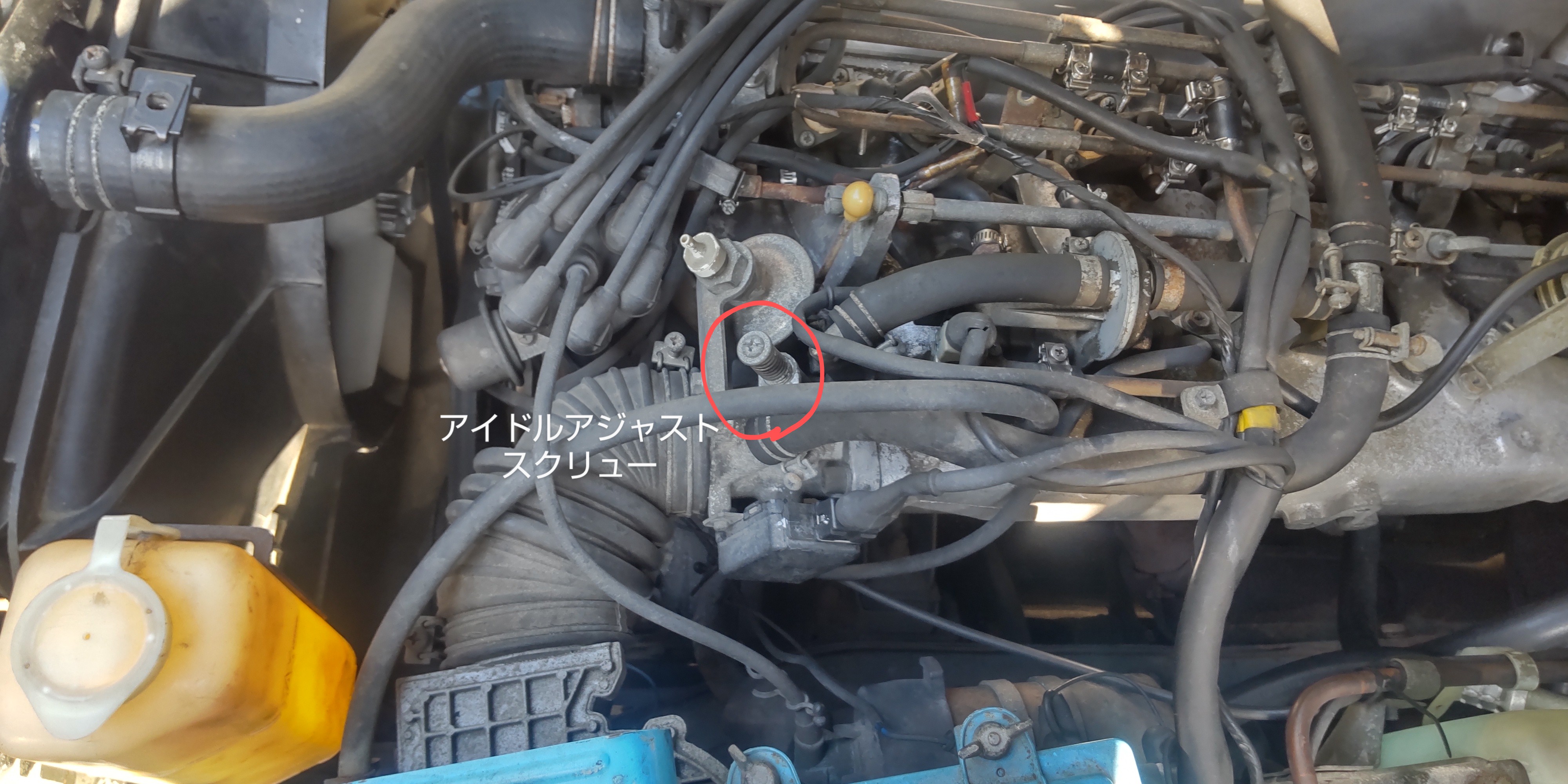 ダッシュポットについては、調整回転数が不明ですが、基本的にはキャブ車と同じです。ということで、ここは特段異常はなさそうです。 貼っていただいた画像のアイドルアジャストスクリュー(IAS)のすぐ上ににあるのがダッシュポットです。 ハイオク使用時の点火時期の話も訂正はありません。 アイドルアジャストスクリュー(IAS)のところはキャブ仕様と大きく異なります。スロットルアジャストスクリューは無くて正解です。アイドル回転数調整はこのIASで行います。スロットルをバイパスさせてエアの量を調整することで、スロットル開度を調整したのと同じ効果が得られます。キャブではアイドル時の空燃比を調整するネジがこの名称なのですが、EGIの場合のIASは空燃比は変わりません(コントロールユニットが自動制御するため)。 強いて言えば、エアフロ本体にゴムキャップを外すと調整ネジがあったと思いますが、そこでアイドル時の空燃比微調整ができたと思います(通常は触らない)。 |