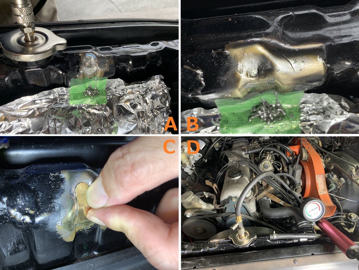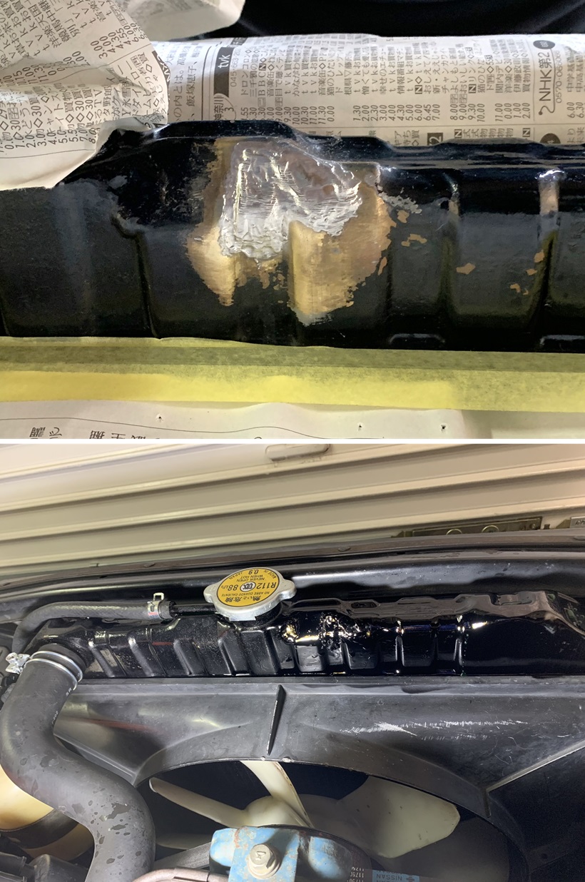 ラジエータキャップテスタにて、1.0kg/cm2加圧して漏れテストを実施、問題ありませんでした。最後にアクリル塗料スプレーの艶ありの黒で補修部位周辺を再塗装して完了です。 添付画像上段は塗装直前の患部。下段は塗装後。 20240901-1.JPEG/339KB |
