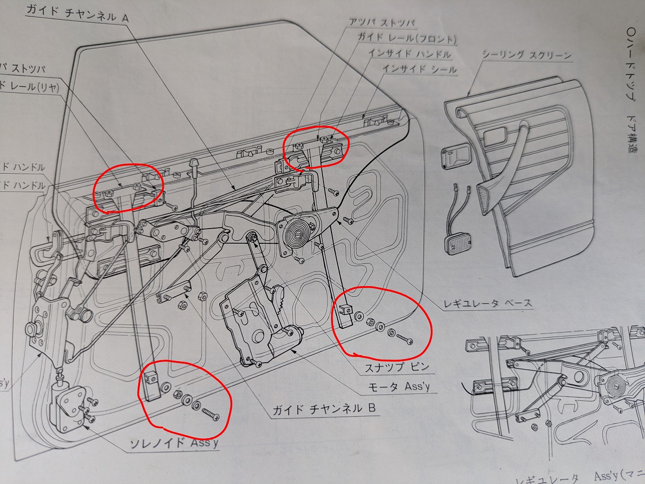 レギュレータ修理を終え取り付けしましたが、ウィンド上端部がウェザーストリップとの密着が悪い(と言うよりは1mmほど隙間がある)状態で、洗車時の水流で水が車内に入る、及び高速走行時に風切り音がうるさい状態です。 取り付け時にガラス調整してみました。 添付画像下側の赤丸部、レール下部ボルト緩め方向でガラスの傾きを多目にしたりレール上部取り付けブラケットを内側にずらしたりしてみましたが、変化なし。 そもそも調整方法はこれで正解なのでしょうか? 自分でメンテにもあるようにH/T系の調整は難しいですね。 ![]() 1759734124.jpg/354KB |