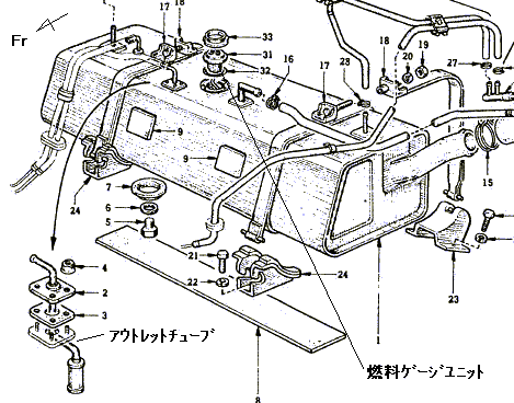 自分でメンテエンジン編のNo.8にある画像を貼っておきます。 電ポンは仰るようにキャブ行き(フィード側)に繋げば良いのですが、できればその前にフィルタを装着したほうが良いです。そうしないと電ポンのフィルタが先に詰まります。 注意点は火気厳禁が一番目ですね。あとはタンク内は内圧が掛かっているので、フィラキャップを外して作業をするのが良いと思います。内圧が上がっていると、ホースを外すだけでどんどん燃料が出てくるので。 もしかして、電ポンはニスモかニスモ風の社外品(トランジスタ式)を購入したのでしょうか? YESならホースコネクタが太い(本来は6.5mmだが、8mm)ので要注意です。 ゲージのほうは、 >ガソリンの量が半分以上入れても、表示されない この部分をもう少し具体的に教えてください。燃料を満タンにして指針がどの位置なのでしょうか? 半分以上上がらないという意味でしょうか? この場合はゲージユニットの前にアース不良の疑いがあります。ゲージユニット本体アース〜ボディーアース間に電気抵抗があると最大まで上がらなくなります。燃料計〜ゲージユニット間の電気抵抗も確認する必要はあるのですが、まずはアースを見てください。フロートが固着することは殆どありません。ゲージユニットがダメな場合は可変抵抗器のコイル部分から可動接点間の接触不良か、端子の腐食です。 それと新品のゲージを入手されたという事ですが、正規品ですか? それとも最近ネットで見かける汎用品でしょうか? 汎用というかS30用の社外品が230に使える様な書き方で見かけるのですが、燃料残量警告灯用のセンサが付いていません。まぁ燃料計がきちんと動けば不要と言えば不要ですけど。 交換難易度はそう高くはないと思いますが、とにかく火気に注意です。なるべくタンク内残量が少ない時がオススメです。それとゲージのOリングは、ゲージのロックリング固定時に捩じれないようにラバーグリースまたはシリコングリースを塗布してください。 個人的には、部品は何を買ったのかが気になります・・・ ![]() tank1.gif/24KB |