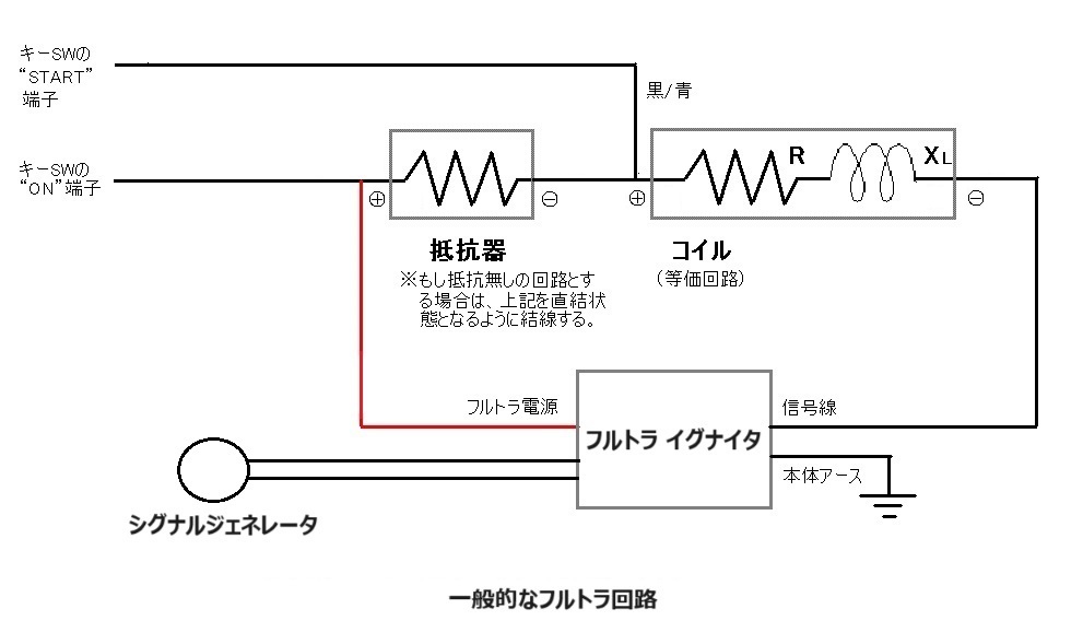 それとコイルの単体テストは抵抗値測定程度しかできないので、この測定値がヘンな数値であればNG判定できますが、そうでないものはまだOK判定はできないのが歯がゆいところです。 コイルの劣化で高温になりやすくなってしまうと、高温時に抵抗が大きくなってしまい、電流が流れなくなります(つまり失火)。また高温状態を繰り返すと、コイルの絶縁が悪くなり、内部ショートしやすくなります。これが冷間時に単体抵抗測定で見抜けるかというと、微妙なところです。 という事で各コイルについてコメントを書きます。 【ペトロニクス製コイル】 抵抗値に問題はなさそうです。 説明書の記載内容は、私も他で見かけたことがあります。低抵抗型なので、ポイント点火の場合は推奨しないのかもしれません。 団長さんはこのコイルをレジスタ付きで使用して正月明け、始動不良に見舞われたそうですが、この時の結線状態を確認したいです。 コイルに入る車両側の線にIGN:ONで12V掛かる回路と、スタートで12V掛かる回路があります。 それぞれどのように結線されたでしょうか? 基本的には下図のポイント式を踏襲して、ONの回路はレジスタ経由コイル+側、スタートの回路はレジスタを通さずに直にコイル+側とする必要があります。 これはクランキング時の電圧低下状態でレジスタを通すことが仇となってコイルに掛かる電圧が低すぎてしまうので、この時だけ直にコイルに電圧を掛けるのです。 もし、スタート側を結線しなかったり、レジスタ経由にすると、始動不良になる可能性があります。 ![]() 【331純正コイル】 抵抗値に問題はなさそうです。 【イグニッションプロジェクツ製コイル】 新品の閉磁路タイプなので、当然OKでしょう。 【永井製コイル】 これは閉磁路タイプでしょうか。これも差し当たって抵抗値に異常は認められません。 ネットでこの製品を確認すると、コイルとイグナイタが同一ブラケットに固定されていて、部品的にはこの2つは一体の取り扱いをしているような感じですが、間違いないでしょうか。 となると、コイルは生きていて、イグナイタが故障している可能性があります。 フルトラの構成部品は大きく3つ。@ピックアップ(シグナルジェネレータ)、Aイグナイタ、Bコイルです。 @はデスビのポイントレス化の際に装着する、回転信号を出す装置です。Aはフルトラの仕様によって、デスビに付いていたり(純正ハイブリッドIC式がコレ)、コイルに付いていたり(永井8700がコレ)、まったく単独装着だったりします。 そして、故障発生率のトップがAなんです。 コイル不良と聞いていたので、イグナイタは除外していたのですが、何となくイグナイタが怪しくなってきました。 いずれにしても、現在の状態で点火系がリフレッシュされた訳ですから、今の状態がベストかと思います。高回転テストは別に意識されなくても大丈夫ではないかと思いますよ。 参考までにレジスタに関するウンチクが書かれているサイトをご紹介します。「青に聞け」というブログの2011年投稿の「イグニッションコイルに外部抵抗器は何故必要か その2」です。今から30年以上前のオートメカニック誌の技術解説はこの方の記事でした。私が先日「インピーダンス問題」と書いた箇所を少しかみ砕いて説明されています(と言っても少々難しいですが)。 |