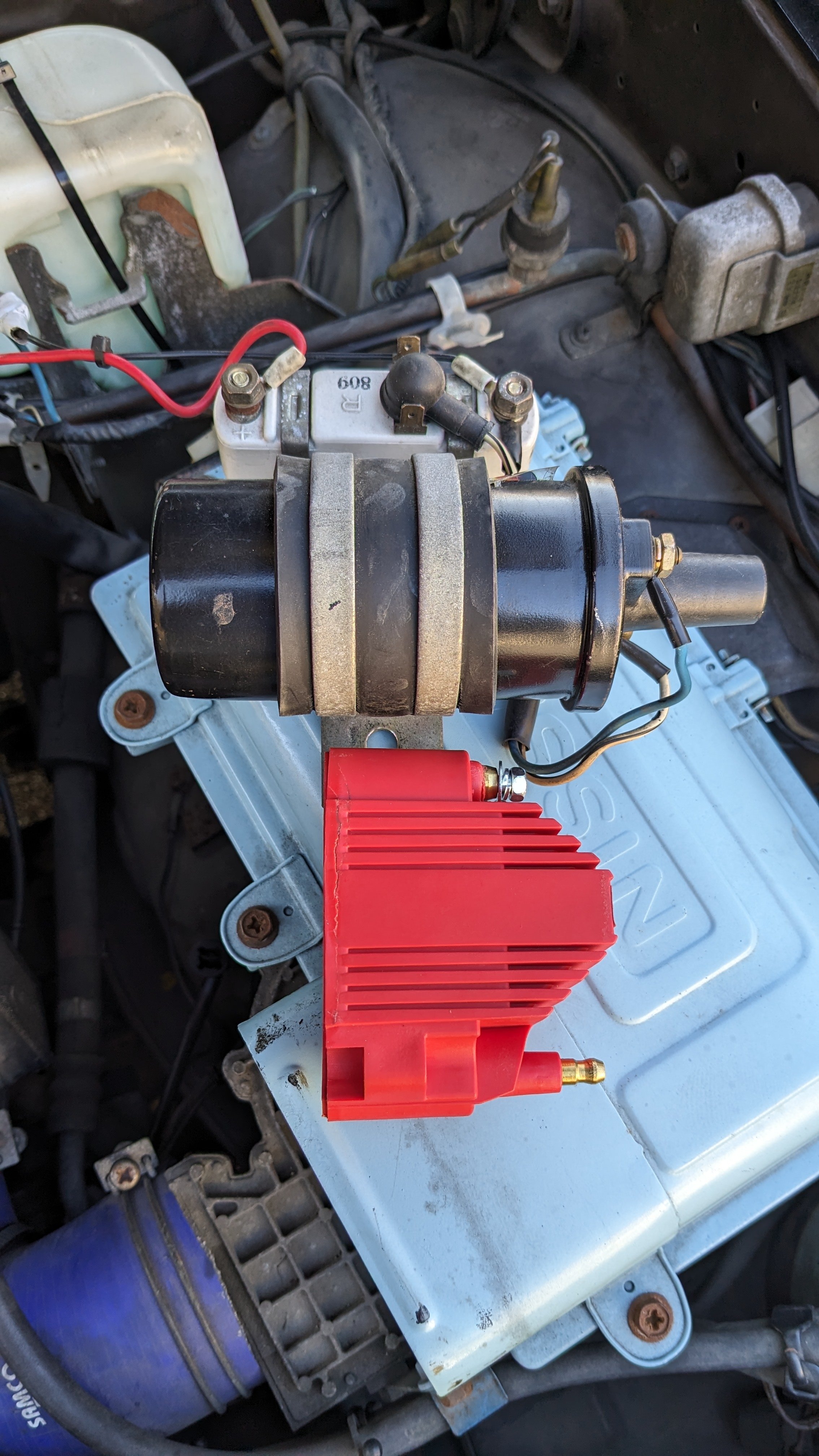 IP製コイルに交換する直前に撮っておいた、ペトロニクス製コイル装着状態の画像がありますので添付いたします。 IP製デスビからの+−配線は外してありますが、実際にはレジスタのプラス端子にデスビ線プラス、同マイナス端子にデスビ線マイナスを接続しておりました。 現在はIP製コイルを純正ブラケットにタイラップで括り付け、レジスタは残したまま回路から外しております。 横から見て、レジスタの上下についている平端子がスタート回路なのでしょうか? マロリー製デスビ装着時(デスビが正常だった時)とIP製デスビ交換直後は、この結線でも問題無く始動しておりました。 永井電子ハイパーイグニッションに付属しているコイルは、閉磁路タイプです。 仰る通り、ブラケットにイグナイタと一体に取り付けられております。短い配線と端子で接続されています。 セットになっていて共に20年近く使用したモノですので、どちらが故障しても不思議ではありませんね。 念のため、国道→バイパス→高速道路と一通り試走しました。 3速で90km/h程度まで引っ張っても、失火も無くスムーズに吹け上がりました。多分ロングランをしても大丈夫かも? リンク先は、工業高校卒ではない自分には難し過ぎました。とりあえず「ポイント式にはレジスタが必要」というのが何となく分かりました。 IP製デスビとコイル、L型搭載車かつバキューム進角デスビタイプで、左記の部品に困っている方には非常にオススメです。 配線も簡単です。セット交換が更にオススメです。 ![]() GC95jp3awAAxdzf.jpg/1098KB |