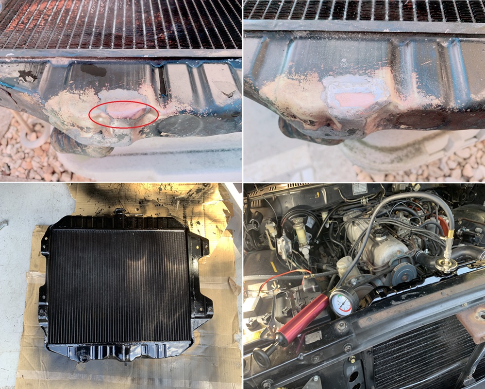 車両からラジエータを降ろし、サンダで塗装を剥がすと、補修部位のハンダクラックによるものと判明(画像左上赤丸部)。このラジエータは15年以上前に部品取り車のものをラジエータ屋に持ち込みコア増ししたものですが、その時に「穴空きがあったので修理した」と言われたのを思い出しました。銅板でパッチを作りハンダで固定したようです。 修理部周辺をサンポールで酸洗い後、クラック部分にハンダを盛っていきます。コテは80Wを使いました。盛った後はサンドペーパーで、凸凹を均します(画像右上)。画像の状態から盛りが足りない感じがしたので、この後、更に盛っています。 最後に黒塗装(画像左下)。 車両に装着しラジエータ圧力テスタで加圧テスト。88kPaで数十分放置。漏れ無しなのでOKとしました。 コア部分の穴あきは修理不能な場合が多いと思いますが、上下のタンク部はパッチをあててハンダ接着+盛りで何とか直せます。基本的には車両から外す必要があります。また、アッパタンク等で見えやすいところは車載状態でも可ですが、水は抜いて作業します。水があるとハンダコテの熱がすぐ冷えてハンダが溶けません。 ちなみに画像右下に写っているS字のアッパホースは今回交換した汎用のホース。ピッタリでした。 リフレッシュ工事はもう少し続きます。週一で2〜3時間程度なので、進捗は牛歩(苦笑) ![]() 20240105.jpg/343KB |