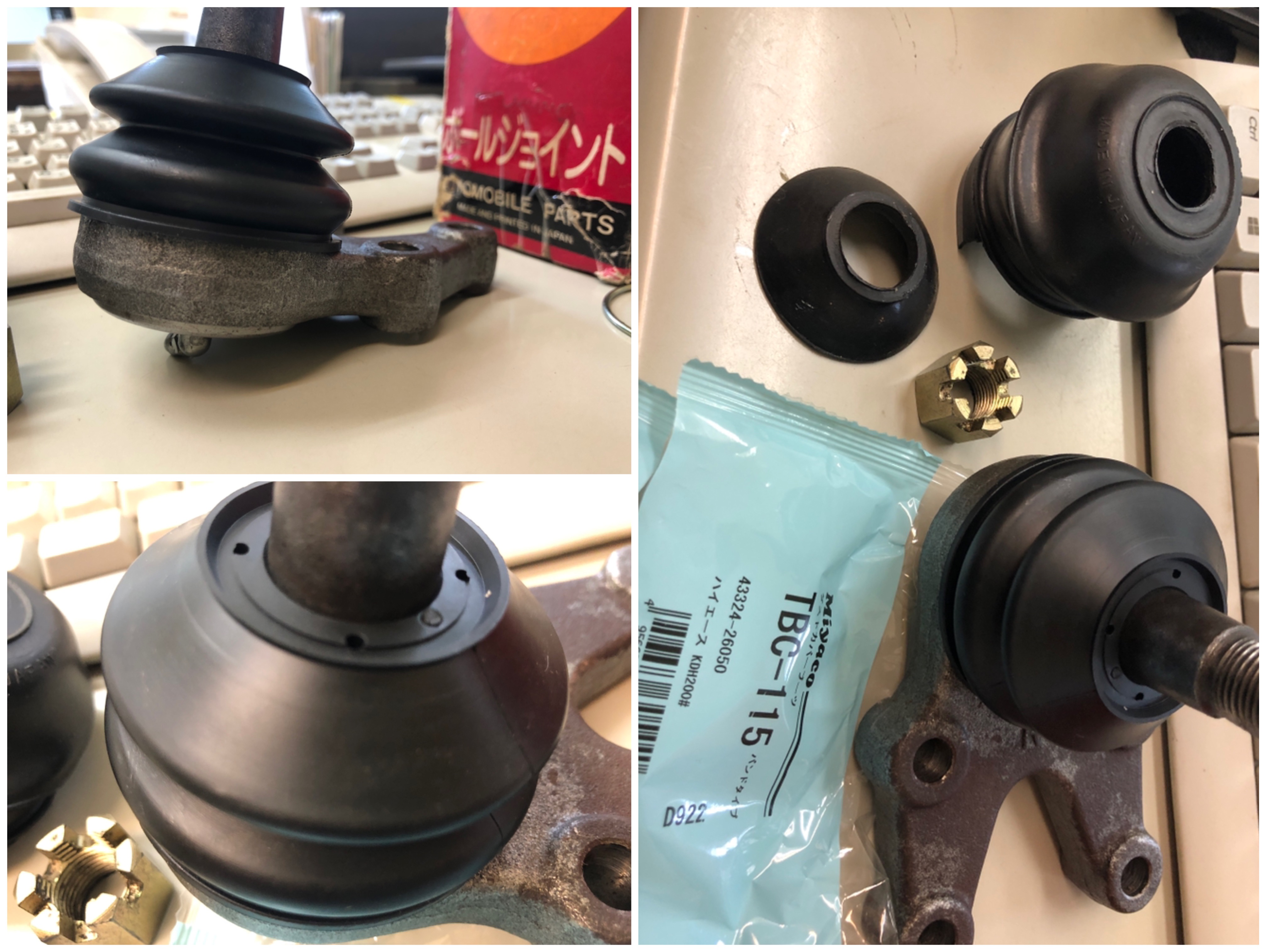 さてピッタリサイズの物がなかなか無いロアアームのボールジョイントブーツですが、何かないかと寸法表とにらめっこして、試行錯誤暗中模索でいろいろ試しに取り寄せてみた中でも200系ハイエースのアッパーアームの物がかなりしっくりなサイズでございました。 ミヤコ自動車品番 TBC-115 230標準と同じバンド留めで、上の口径も下の口径も高さもしっくりくるものでございます。 なかなかあのゴツいロアアームを外す機会無く(整備書を見るとハンマで打って外すとか?難しそう…)実車交換には至っておりませんが、おそらく使用に耐えうるものだと思います。 現在我が愛車では過去オーナーが着けたと思われるおそらくトヨタ・コースターの物が着いておりますが、上の口がガバガバ気味なので早い段階でこちらの物に交換したいと思います。 なかなかネットを探しても見つかる情報ではございませんので何かの参考になればと思い、紹介させていただきました。宜しくお願い致します。 IMG_3020.JPG/1281KB |