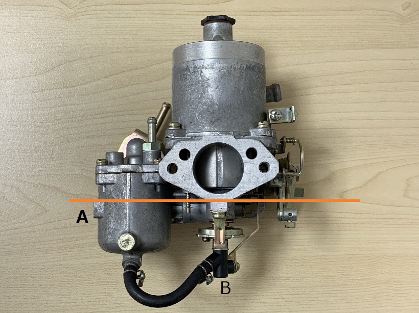 GTXさん>アイドルアジャストナットはアイドル時の調整用なので、そこを弄ってもアイドル以外の領域の空燃比は変化はありません。 プラグが黒くなる時は、全領域で濃い可能性が高いので、油面チェックが第一です。 ツールが無い場合の油面のチェック方法は以下のようにします。 下の画像A部のフロートチャンバーの凸部(そこにキャブ型番が印字されている)の上辺付近が基準の油面の高さです。 次に、フロートチャンバー底部からノズルを繋ぐホースのノズル側(画像B部)で外し、燃料が漏れない様に摘まんで、油面の高さ以上に持っていきます。 摘まんでいたホースを緩く持ち、ホースの口の中を覗きながら徐々に下げていきます。オレンジライン上に油面があればOK。許容範囲はプラマイ2mmです。 これをやってみてください。もちろん、ツールを自作していれば、それを使って結構です。 油面が高くなる主な原因ですが、 @ニードルバルブの摩耗(テンションスプリング衰損も含む) Aフロートのパンク B燃圧が高すぎ の3つが考えられます。 注意したいのはBです。ポンプ変更時にこれに遭遇することがあります。例えば、機械式または純正の三つ葉製ポイント式電磁ポンプだったのを、ニスモのトランジスタ式電磁ポンプにすると、燃圧が0.1〜0.2kg/mm2ほど上がるので、この差が油面上昇に繋がります。心当たりはないでしょうか。 GL230 さん>はじめまして。それは明らかに異常です。いくら古くてもそれは異常だと思います。 8月に納車とのことですが、その時はどうでしたか? 納車時からだったら、入手元から何か情報はありましたか? 可能性としてはキャブ不調が怪しいところですが、アイドル状態で「ドッドっドッド」となってから放っておくと自然と解消するのか、そのままか、エンストするのか、どんな感じなのでしょうか。 >又、バックギアに入りバックするとカンカンカンと聞こえます、 これなんですけど、実際生で聞いてみないと何ともですが、エンジン本体(の中の下のほう)から聞こえてくる場合、コンロッドの打音の可能性があります。もしそうならエンジンO/Hか中古orリビルトエンジン等との載せ替えが必要と考えてください。 パワーバランステストをすると何気筒目がダメなのかは判断できます。 当サイトの、「自分でメンテ」⇒ エンジン編 ⇒ 現象別トラブルシュート一覧 ⇒ IV.異音 ⇒ 5.エンジン下部からの金属的なコンコン、カンカン音 を参照してみてください。 ![]() 1665219057.jpg/208KB |