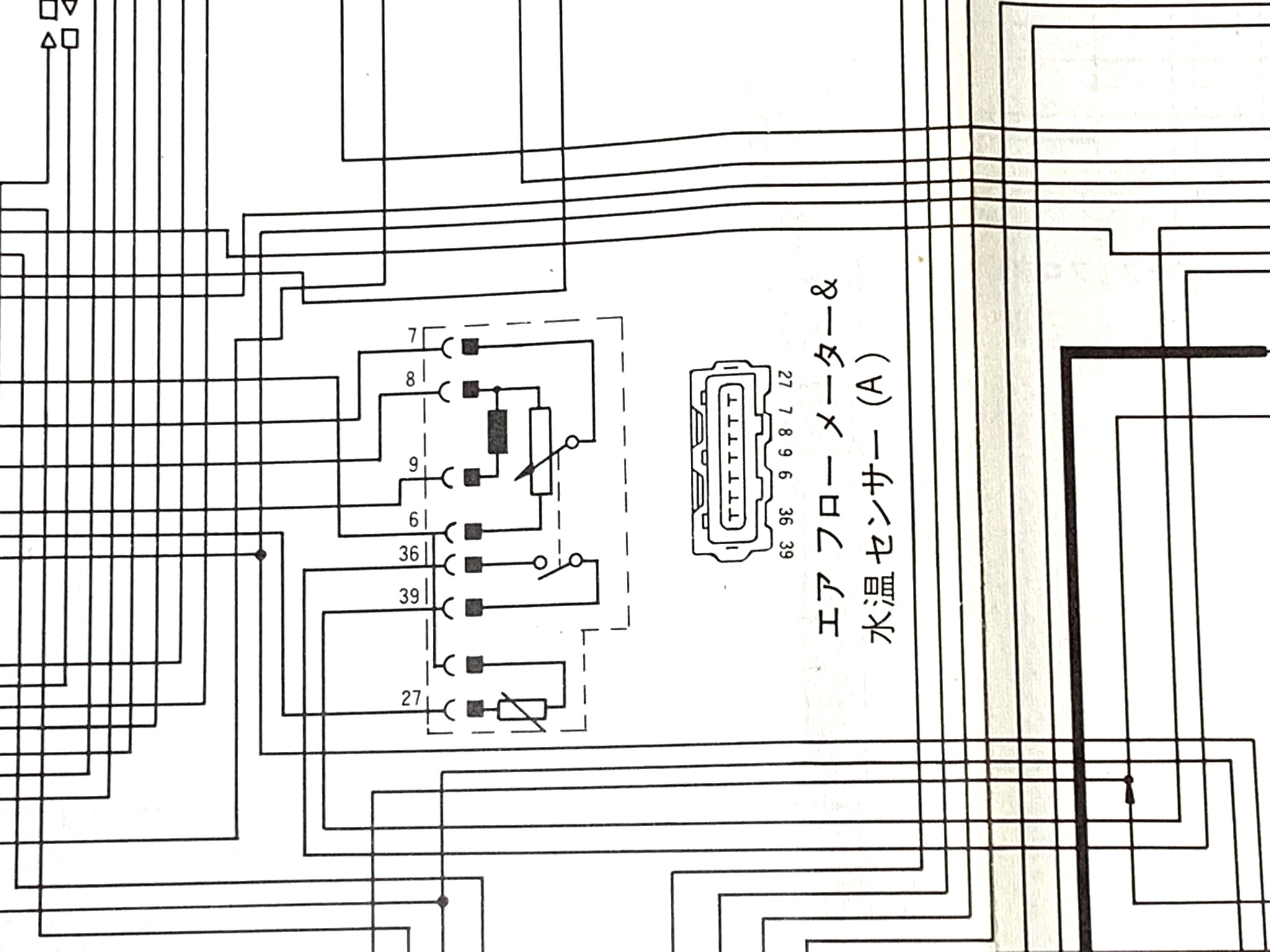本日、エアフロ調査しました。 以下に記載します。 ・2000〜2500回転くらいでの不調なので、フラップのスプリングは正常と判断しました。 ・エアフロのコネクタ(メス側)は若干の腐食が見られました。※端子同士の接続部分に腐食はありませんでした。接点復活剤とエアブローにて清掃しました。 ・エアフロの端子は7ピンでした。 左から39、36、6、9、8、7、27と記載ありました。テスターはデジタル式持ってましたので、どこを測定すればいいか助言頂けると幸いです。 6、9、8、7の線間でしょうか? よろしくお願い致します🙇 DSC_0437.JPG/1991KB |