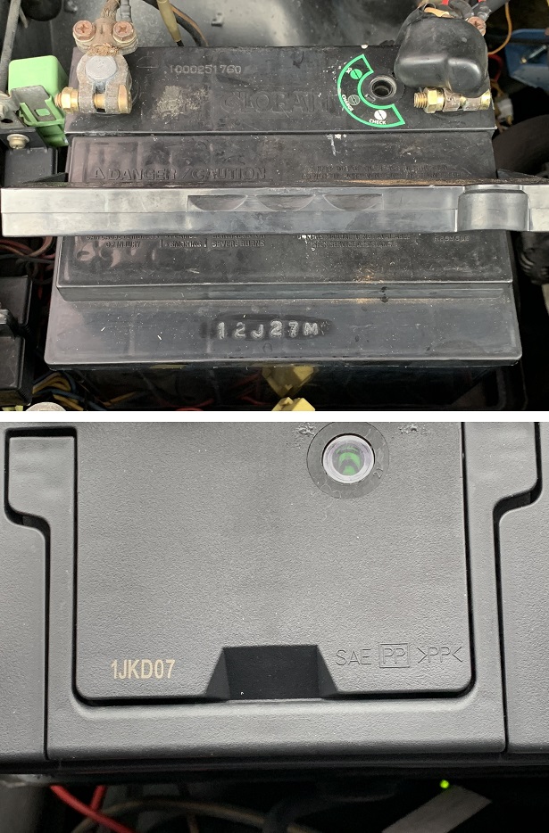 画像は製造番号を撮影したもの。製造時期を確認できます。製造番号はブランドによって標記ルールがかなり違うし、特に公開もされていないので推測となりますが、画像上段は今まで装着していたもので、「12J27M」とあるので、多分2012年10月製造かなと。「12」は西暦下2桁で、「J」は1月、2月をA、B・・・と刻むと10月が「J」です。装着タイミングと比較すると合致します。 欧州製バッテリでは週番号で記載され、例えば「35-20」であれば「2020年の第35週=2020年8月24日週」ということになります。欧州でよく見かける週番号方式は日本人には見慣れないので、換算する必要があります。バッテリにはこれが電極に打刻してある場合が多いです。 写真下段は本日交換した新品。「1JKD07」とあるので、多分2021年10月製造。これは「1」が西暦下1桁で2021年、「J」が先ほどと同じルールで10月、と推測できます。あれ?ちょっと古いナ。在庫期間9か月ということになります。 バッテリは生ものですから長期在庫は保証付きで販売できなくなります。一般的には在庫期間12か月〜15か月以内が保証付新品で販売できるようです。ということはギリOKか。 今回のバッテリが9年半もったということで、私自身新記録です。次はこれの原因の考察。バッテリは一般的にサルフェーションが原因で充電容量が低下していきます。だいたい2〜4年くらいで使用が困難になり、「寿命」として交換されます。特に放電が多いと寿命は縮まります。 この対策として、 @サルフェーション防止(除去)装置(パルス電流を流すタイプ)をバッテリ端子に追加 Aガレージに車両を保管するときは、バッテリ充電器を接続、プログラムタイマで1時間に15分ずつ充電 を行った結果が延命できた、と判断しています。 バッテリ故障はサルフェーション以外に内部電極板の脱落や短絡などもあるので、これは防げないでしょうけど、サルフェーションは上記2つで効果があるようです。@の装置はネットで2〜4千円くらいで入手できます。12.5Vを超えると自動的にONするタイプです。Aは40年ほど前に私の父親がホームセンターで購入した充電器を使用しており、0.5A程度で充電するタイプ(この微弱電流がちょうどよい)。この2つの組み合わせで、かなり長時間@を作動させることができます。基本的には満充電状態なら充電器ONで@もONします。タイマで充電器OFFになってもバッテリの調子が良ければ一定時間約12.7Vくらいを維持するので、@はONを続け、状況によってはほぼ一日中サルフ除去を行えます。ガレージにコンセントがあることが必須条件になるので、月極駐車場では難しいかもしれません。 ![]() 20220716.jpg/240KB |