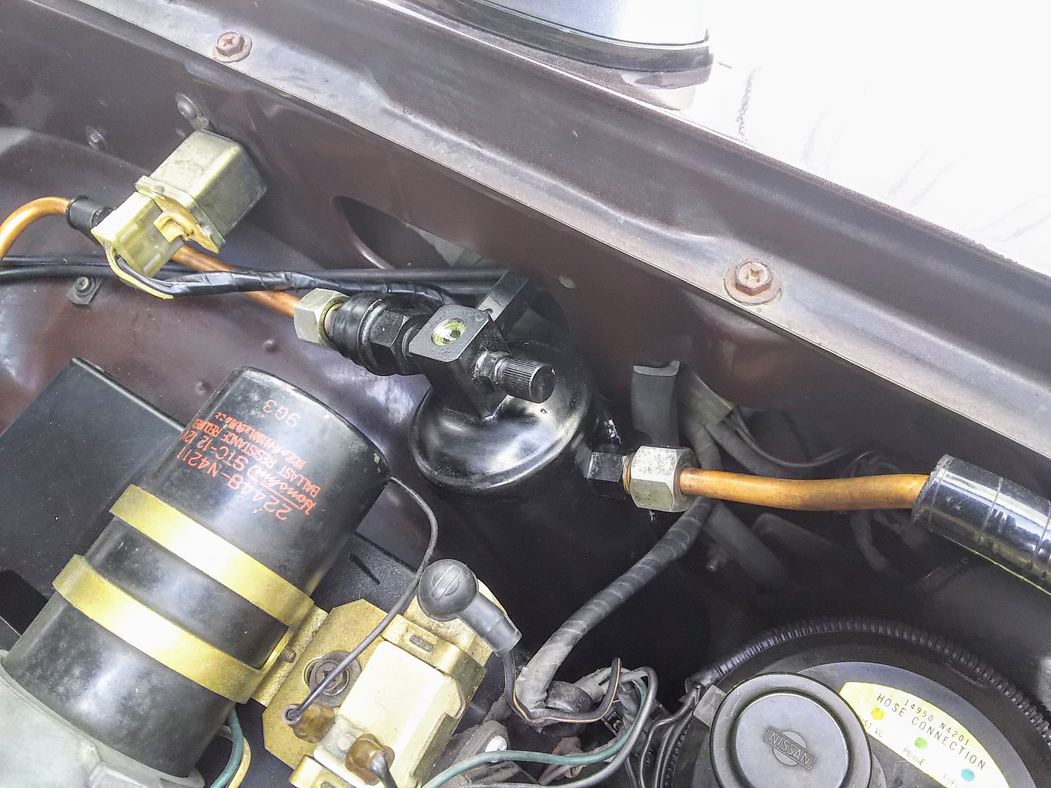 配管については、パイプもフレアナットもホームセンターで購入できます。しかし加工にパイプベンダーとフレアツールが必要ですので、やってくれる業者にお願いすると良いかもしれません。国産メーカー系ディーラーなんかですと、配管作成なんて200%ありませんので、再作成という概念すらありません。一般整備業者でもそういうところも多いと思います。電装屋さんなら大丈夫かな、と思います。汎用エアコンでは取り回しに融通の利かない金属管ではなくホースで繋ぐのが多いようです。 20年くらい前に130セドに乗っていたころに銅管で再作成した高圧配管の画像がありましたので貼っておきます。リキタン(車両入手時から汎用品です。一度詰まりまた汎用品に交換しましたがこれが交換前か後かは失念)出口から冷却水サブタンク、ウォッシャタンクを避けながらUの字を描いて直角に方向転換(画像では写っていません)、IGNコイルのすぐ下を通ってエンジンルーム後方に行くパイプです。この画像はAfter画像ですが、Before画像は自分でメンテ電装編⇒4.エアコンクーラートラブルシュートのページ内の「2.構成部品のお話」にあります。 130_2006_DSCF1341.JPG/359KB |